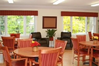 Our setting is tastefully decorated with plenty of seating that is not only comfortable, but is designed for our participants who may have difficulty getting in and out of chairs. You or your loved one will feel right at home whether engaging in group activities in our activity room, having a conversation with friends around the gas fireplace with protective screening, reclining in the quiet room when down time is needed, or relaxing outdoors in the fenced-in sitting area taking in the sights and sounds of nature.